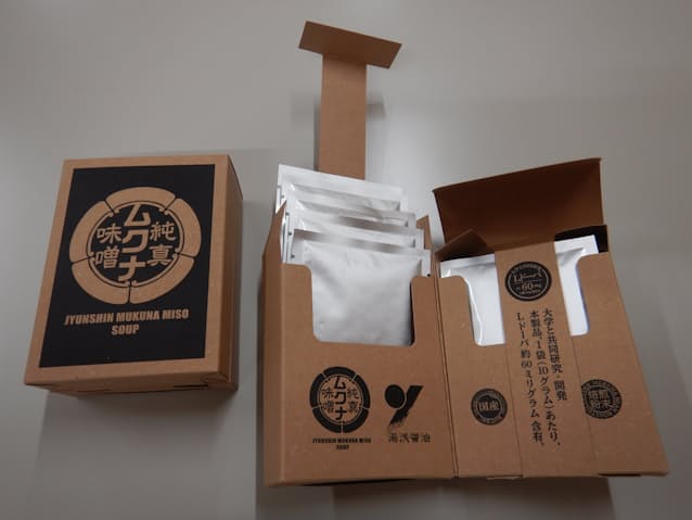 同社の通販サイトと店舗で発売する「純真ムクナ味噌」は、1袋10グラムの粉末味噌汁10袋入りで価格は2484円。1袋にLドーパ60ミリグラムを含む国産ムクナ豆2グラムが入っている。同社の通販サイトと店舗で販売する。