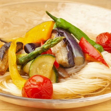 - 冷やしたそうめんを器に盛り、焼いた野菜をトッピングする。