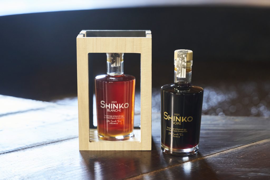 油発祥の地として知られる和歌山県湯浅町で明治14年(1881年)に創業した老舗の醸造元『丸新本家』の醤油部門である湯浅醤油有限会社(本社:和歌山県有田郡湯浅町、代表:新古 敏朗)は、フランス、サンテミリオンのワイナリー(シャトー・クーテット)オーナーのアドリアン・ダヴィド・ボーリュー氏(以下、アドリアン氏)と共同醸造した、ワイン樽で発酵・熟成させた醤油「SHINKO NOIRE」「SHINKO BLANCHE」の2025版を【醤油の日】2025年10月1日(水)販売開始しました。
