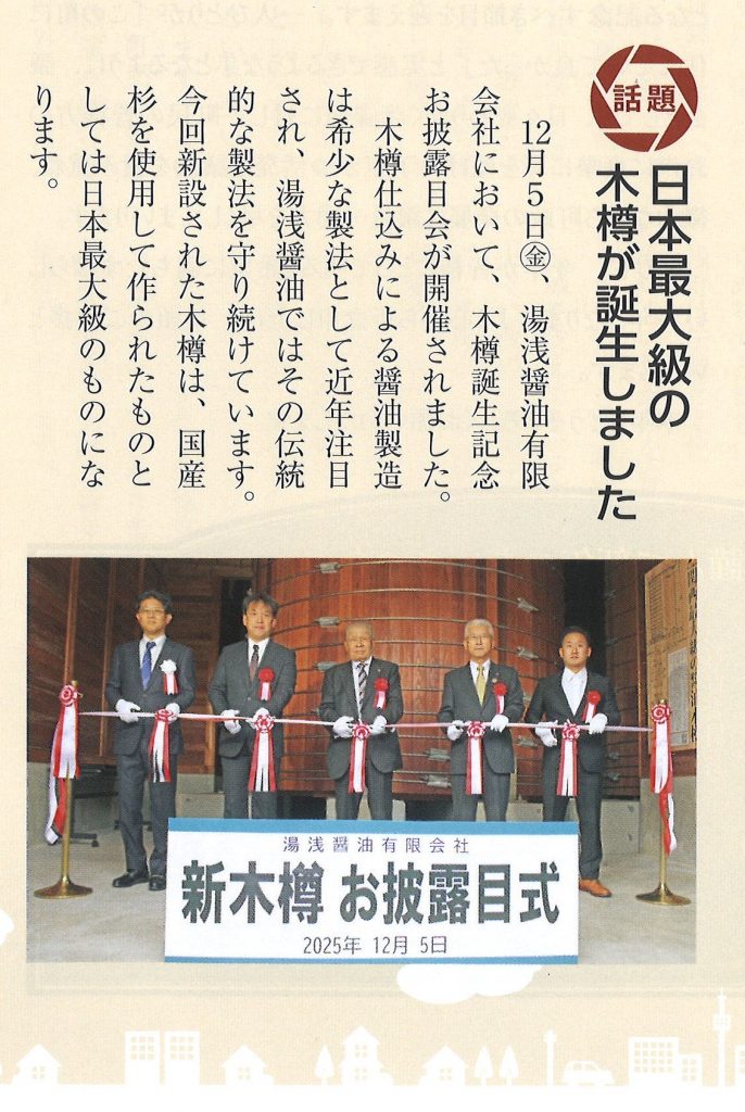 湯浅町の広報誌『広報ゆあさ2026年1月Vol.614』町の話題に、2025年12月5日に開催した新木樽のお披露目式典について掲載していただきました。