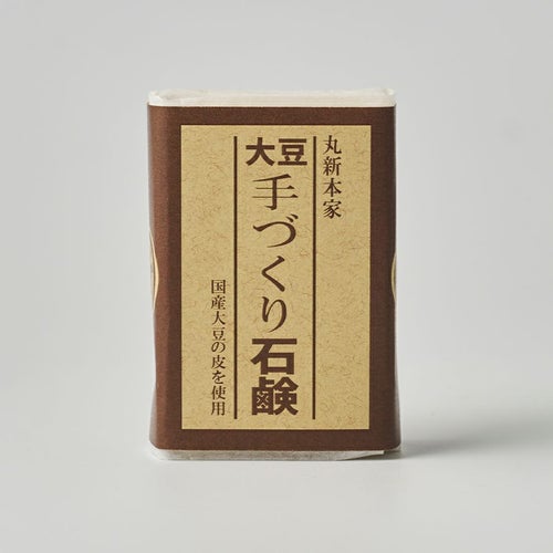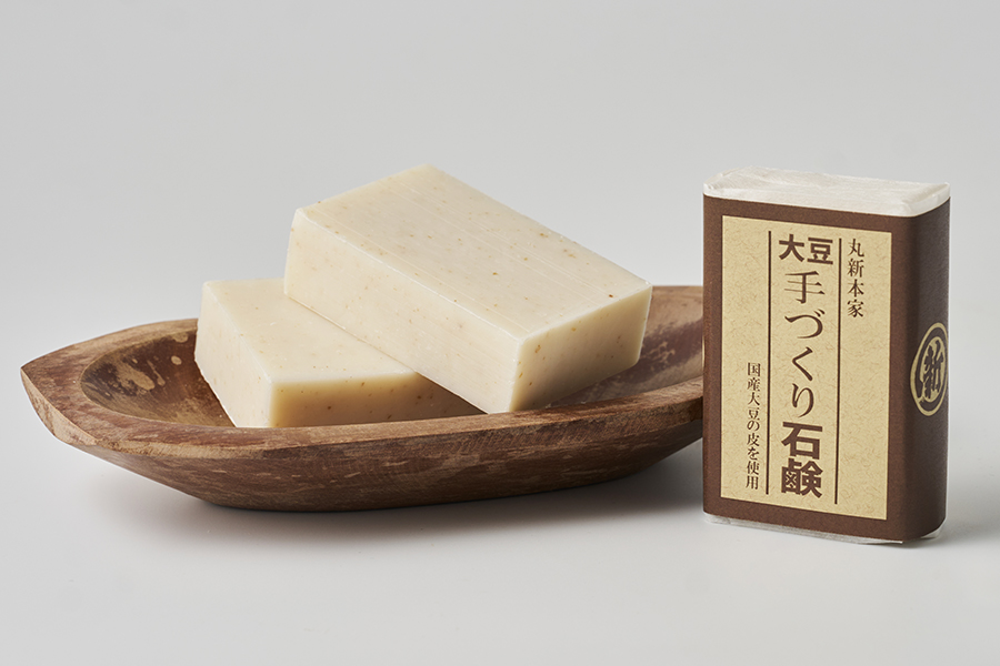丸新本家では、製造工程において年間約500kgもの大豆の皮が排出されています。 大豆の皮は、皮でも栄養豊富な為、近隣の農家さんから肥料としてとても喜ばれています。また、養鶏のぼかし肥料の材料としても大変好評で活用されてきました。この大豆の皮を石鹸としてアップサイクルし、商品化したものです。