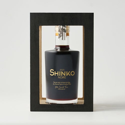 和歌山県湯浅町の湯浅醤油有限会社と、世界的に有名なワインの産地フランス・サンテミリオンの歴史あるワイナリー「Chateau Coutet(シャトー・クーテット)」で、オーナーのアドリアン・ダヴィド・ボーリュー(Adrien David Beaulieu)(以下、アドリアン氏)と共同醸造したワイン樽で発酵・熟成させた醤油「SHINKO NOIRE」(シンコ・ノワール)です。