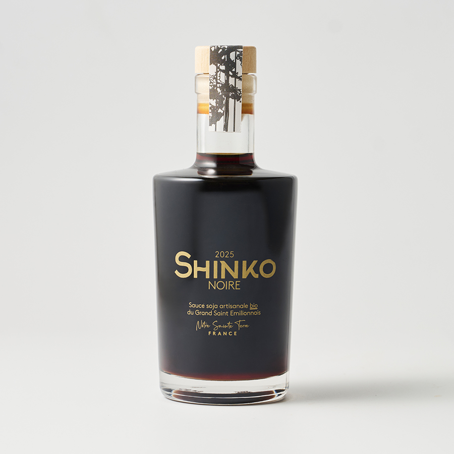 「SHINKO NOIRE」は、フランス産のオーガニック大豆と小麦、そしてイル・ド・レの塩田で造られた塩を使用し、ワイン樽で12ヶ月間熟成された醤油です。フランスの伝統的なワイン製造技術を取り入れたこの醤油は、透き通った黒色とともに、甘みがあり後味が軽やかな特徴を持っています。ユーロリーフマーク(EUのオーガニック有機認証)とABマーク(フランスのオーガニック有機認証)の両方を取得しており、原料にこだわる湯浅醤油の理念を体現する逸品です。