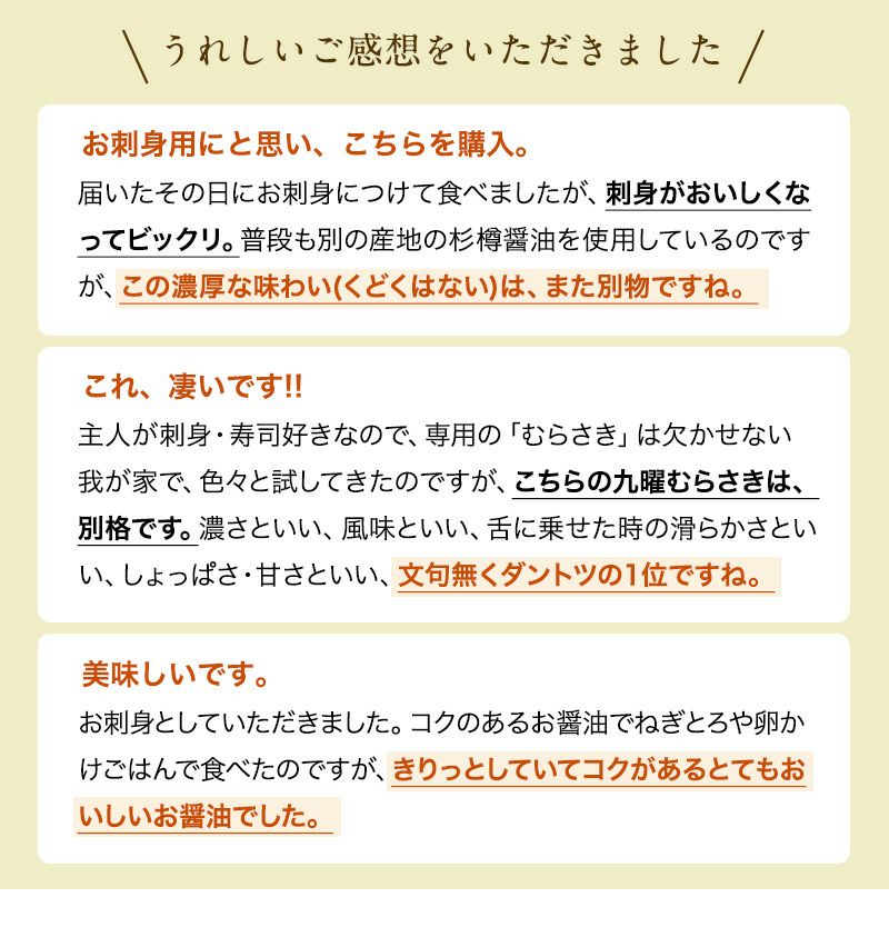 1年6カ月以上熟成。濃厚で深い味わいのスッキリ味。香りが良い。寿司や刺身、おひたし、煮魚、ラーメンなどに。どんな料理にも合います。
