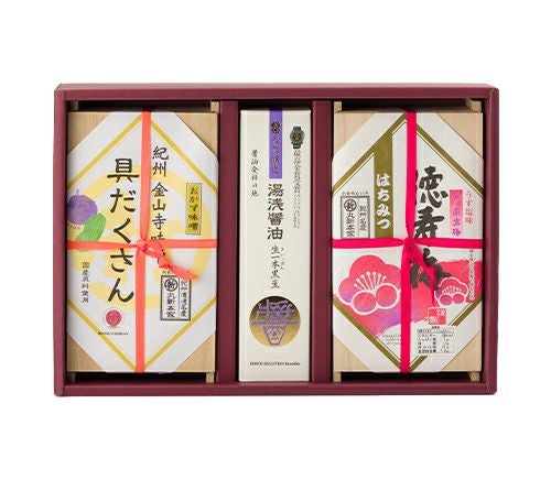 他の画像を見る 販売価格 ¥ 8,542 税込 お気に入りに登録する 在庫切れ 【贈答用 ギフト しょうゆ 味噌】 湯浅物語〔大〕(うす塩味金山寺700g・湯浅醤油・はちみつ梅干600gギフト)【54143】