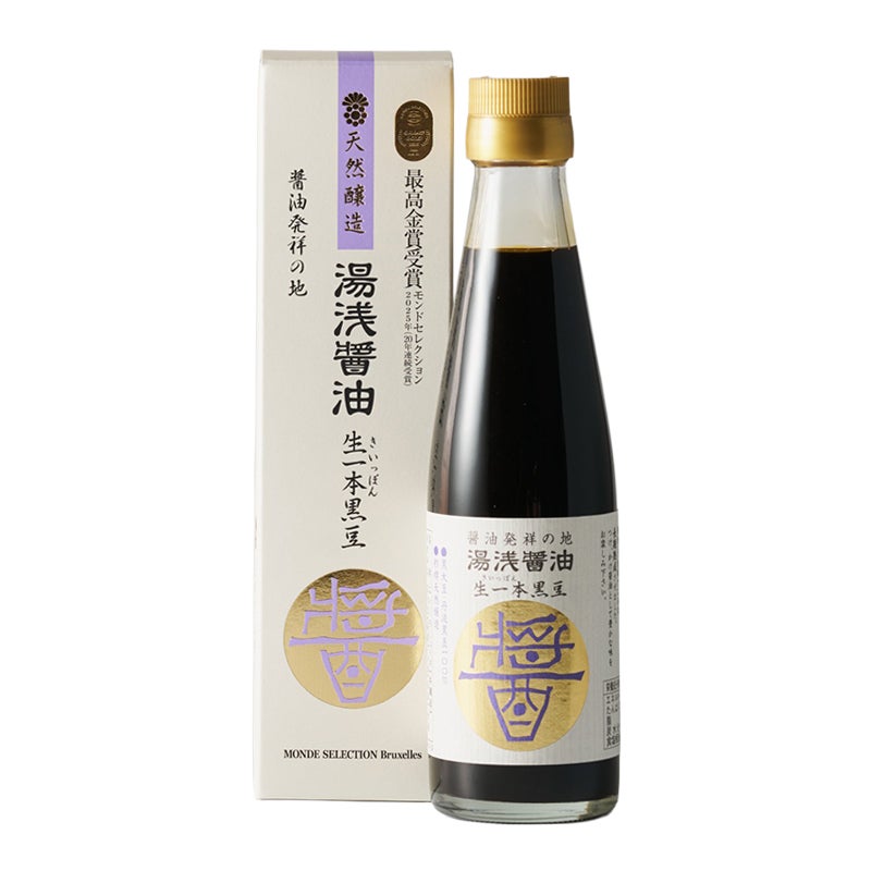 厳寒の冬に仕込み、天然の木樽で2年以上じっくり熟成させることで濃厚で深い味わいの香り豊かな醤油になります。 木樽から搾ったままで何も加えていないのに、黒豆の持つ自然の旨みと甘みがまろやかで深い味わいを出してくれます。 色はワイン色、香りと旨みがお口にぱっと広がります。 肉料理にソースや、お刺身や冷奴、おひたしに。焼き餅に使ってもおいしいです。 2006年からモンドセレクション毎年連続で最高金賞受賞です。